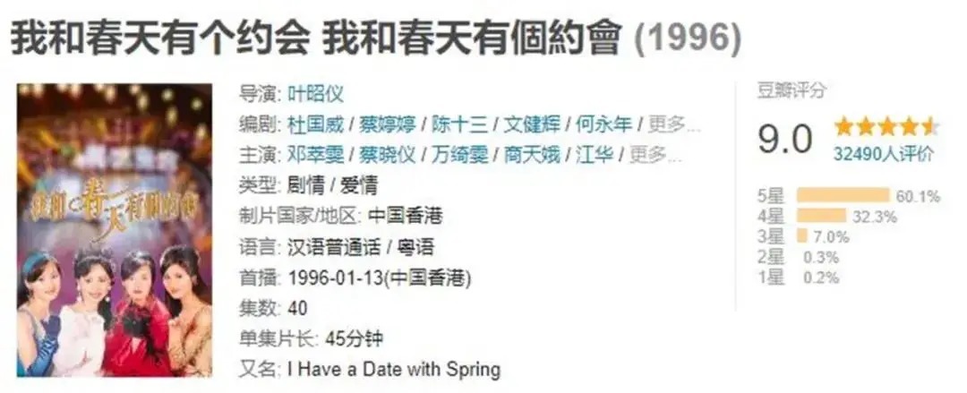 《我和春天有个约会》是亚视的一部王牌代表作,豆瓣评分高达9.0,该剧于1996年1月播出,邓萃雯在剧中饰演姚小蝶。