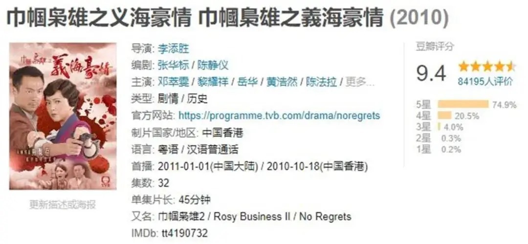 《巾帼枭雄之义海豪情》豆瓣评分高达9.4,超越了《上海滩》《射雕英雄传》《大时代》等经典剧集,成为港剧史上豆瓣评分最高的剧集。