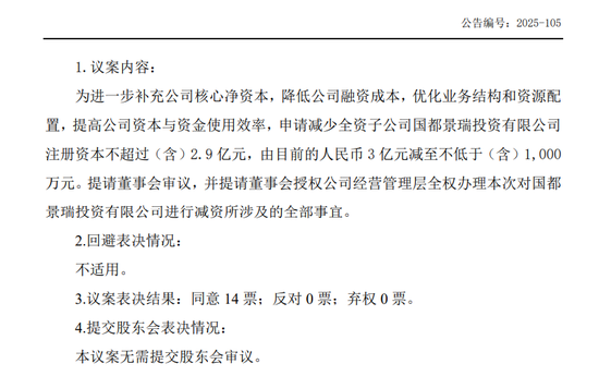 翻查2024年报,国都景瑞的注册资本尚有15亿元。而总资产达到15.91亿元,净资产15.81亿元。2025年中报披露,2025年7月国都景瑞注册资本减至3亿元。